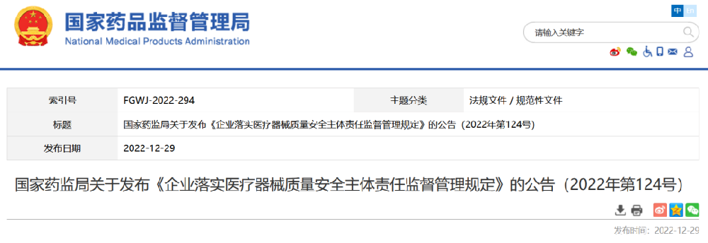 2023-02-102022年12月29日,國家藥品監(jiān)督管理局發(fā)布《企業(yè)落實醫(yī)療器械質(zhì)量安全主體責任...